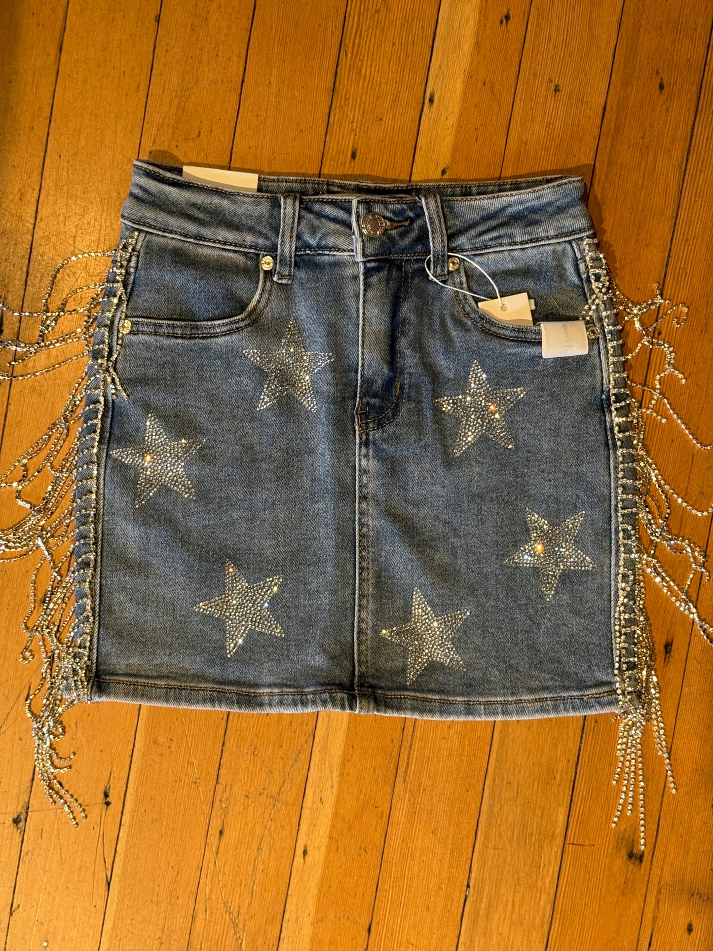 Get ready to shine in the Star Spangle Skirt, featuring dazzling star bling and sparkling jeweled tassels that bring rodeo-worthy flair to your look. Perfect for adding a playful sparkle to any outfit, this skirt turns heads with every step.